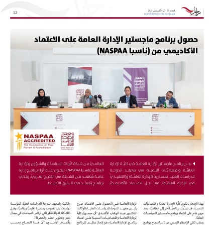 والكلية ولمعهد الدوحة للدراسات العليا ،كمؤسسة الإدارة العامــة فــي الحصول علــى الاعتماد ،صرح بهذا الإنجاز ،تكون كلّية الإدارة العا ّمة واقتصاديّات