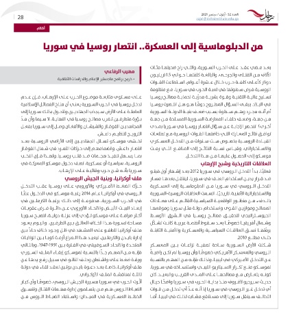 في الحــرب الســورية ،مدفوعــة إلى ذلــك برغبــة الكرملــن في المصالـح وموازيـن القـوى واسـتخدام دولـة مثـل سـوريا وموقعهـا